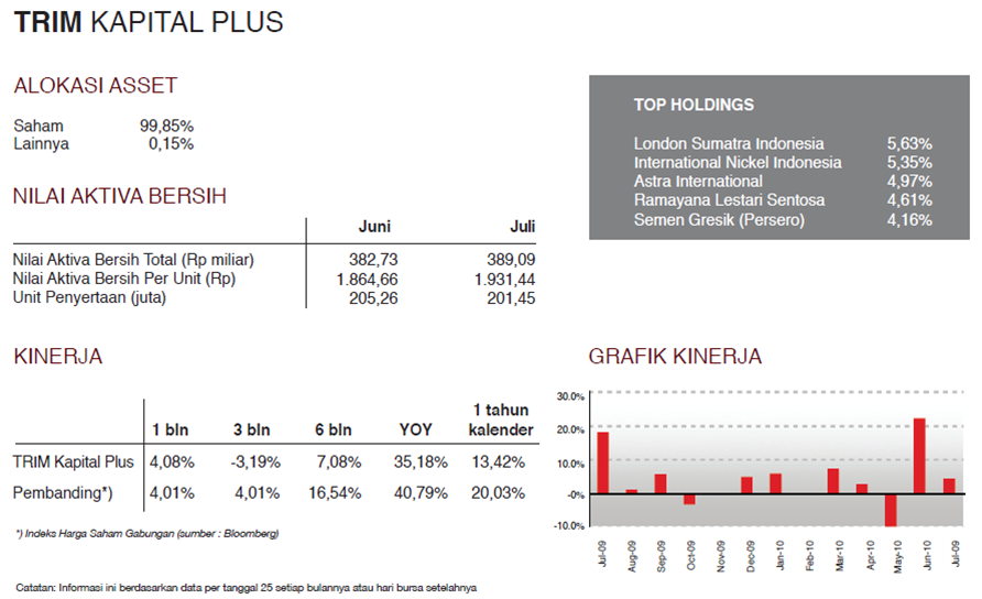 NAB dari TRIM Kapital Plus pada Bulan Juni adalah 382,73 Milliar naik menjadi Rp 389,09 Milliar pada Bulan Juli. Artinya total jumlah dana kelolaan yang mencakup kas dan instrumen investasi bertambah pada bulan Juli sebesar 6.36 milliar atau 1.66%.