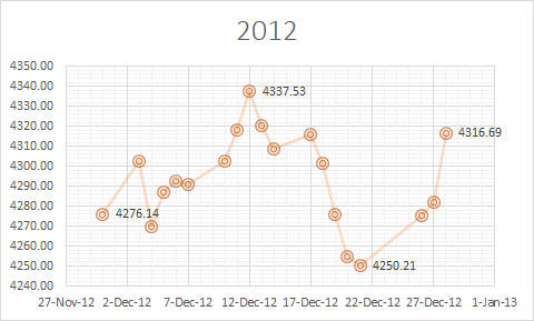 Titik tertinggi 2013 tercapai pada awal Desember dan kemudian terus mengalami penurunan. Titik terendah lebih rendah dari penutupan akhir November dan rebound pada hari terakhir.