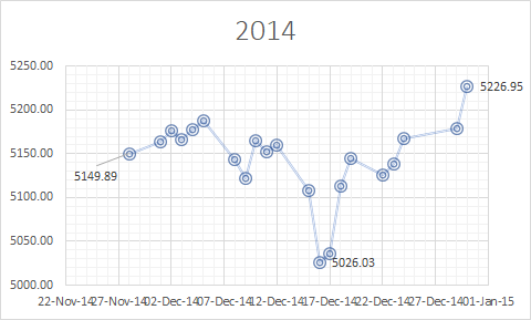 Titik tertinggi 2014 terjadi pada hari terakhir 2014 dan sempat turun signifikan pada pertengahan Desember.