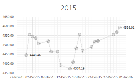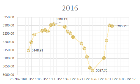 Titik tertinggi tercapai pada 12 Desember dan mencapai titik terendah pada 22 Desember dan kemudian mengalami rebound pada akhir tahun