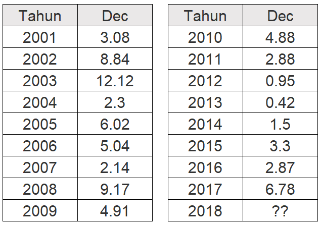 Berikut ini adalah tingkat return IHSG pada bulan Desember mulai dari tahun 2001 sampai 2017