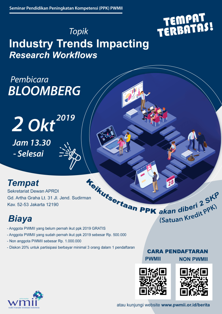 Dalam rangka Pendidikan Peningkatan Kompetensi (PPK). Diselenggarakan oleh Perkumpulan Wakil Manajer Investasi Indonesia (PWMII) yang bekerja sama dengan Bloomberg dengan topik “Industry Trends Impacting Research Workflow” yang diadakan pada :