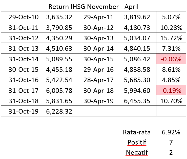 Berdasarkan pengamatan data IHSG dari tahun 2010, secara historis untuk periode Mei – Oktober tercatat 5 kali membukukan return positif dan 5 kali return negatif termasuk pada tahun 2019 ini. Rata-rata dari return selama bulan Mei – Oktober adalah 1.95%.