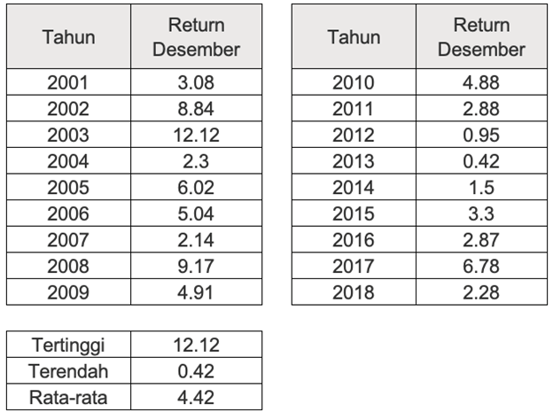 Apakah fenomena ini juga berlaku di pasar modal Indonesia? Untuk mengujinya, berikut adalah data Indeks Harga Saham Gabungan (IHSG) bulan Desember dari tahun 2001 hingga 2018.