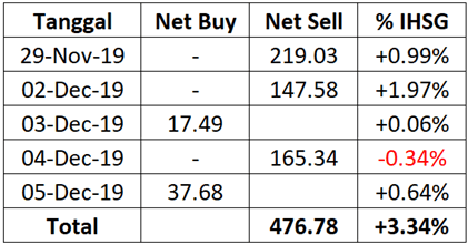 - Total Transaksi Investor Asing dari tanggal 29 November – 5 Desember 2019 adalah Net Sell sebesar 476.78 M
