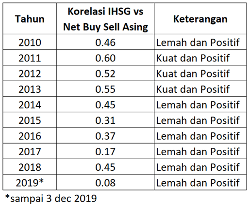 Untuk mendapatkan gambaran yang lebih lengkap, maka dilakukan penelitian menggunakan data 10 tahun terakhir dari 2010 hingga 2019. Korelasi antara Kinerja Harian IHSG dengan Net Buy Sell Asing adalah sebagai berikut :