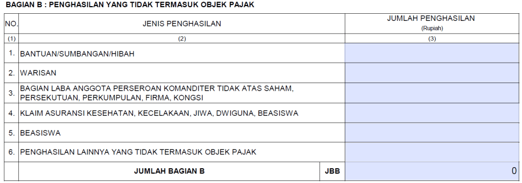 Pada dasarnya SPT pajak untuk WP Perorangan terdiri dari 3 bagian, yaitu Penghasilan, Harta, dan Kewajiban. Bagian Penghasilan dibagi lagi menjadi 3 bagian lagi yaitu Penghasilan yang kena tarif pajak progresif, Penghasilan yang kena tarif pajak final, dan Penghasilan yang bukan objek pajak.
