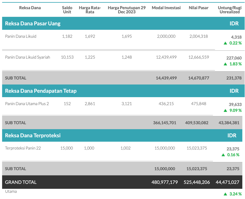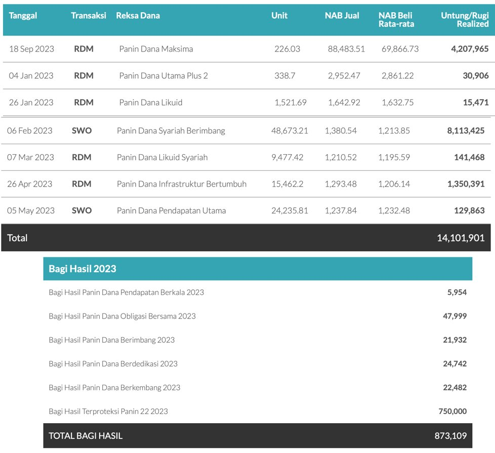Selama 2023 investasi reksa dana dilakukan kombinasi antara Autodebet bulanan, switching ketika ada momentum, cutloss atau profit taking, dan menerima bagi hasil dari reksa dana terproteksi dan pendapatan tetap.