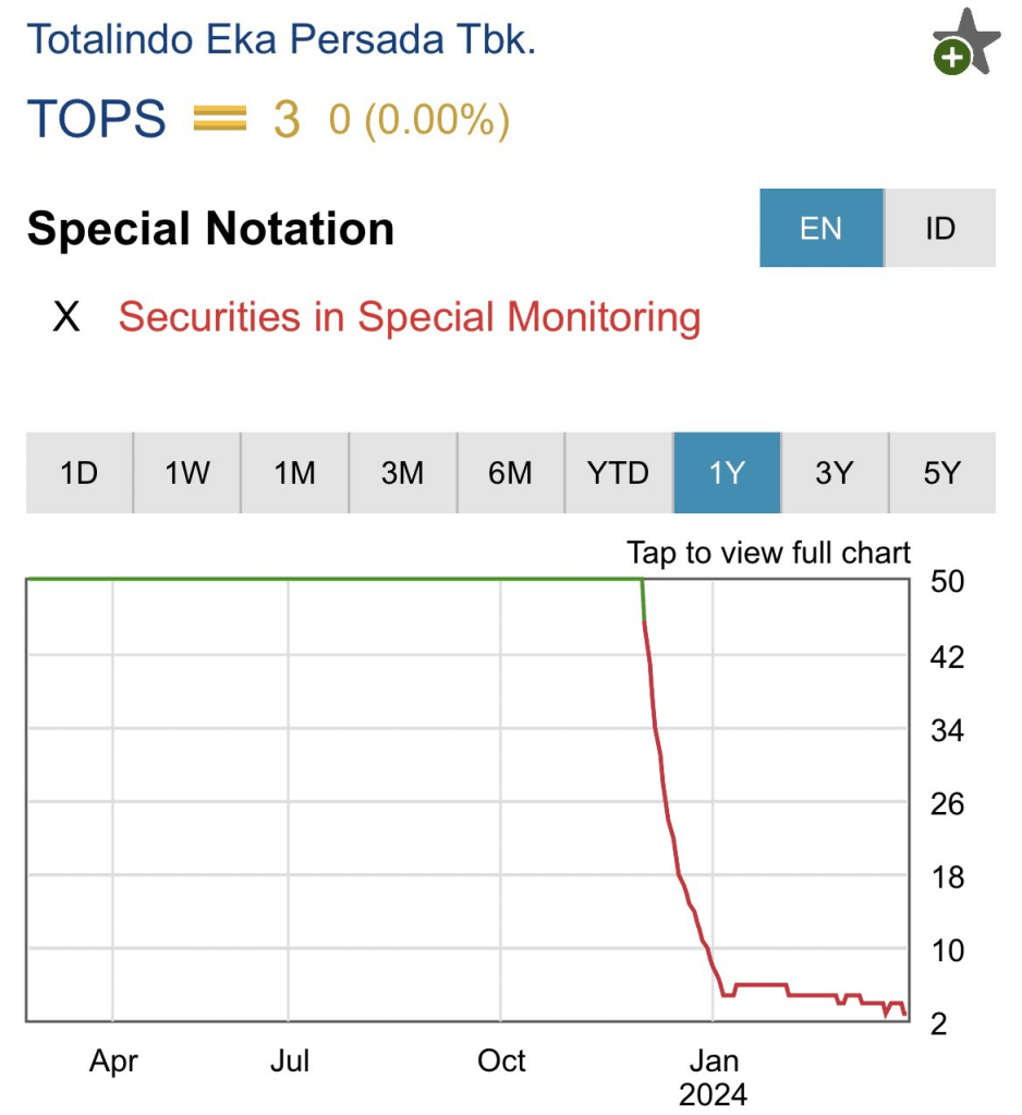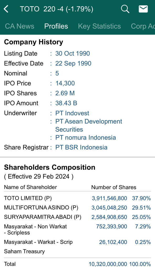 Contoh saham TOTO kena karena Free Float kurang dari ketentuan 7.5%