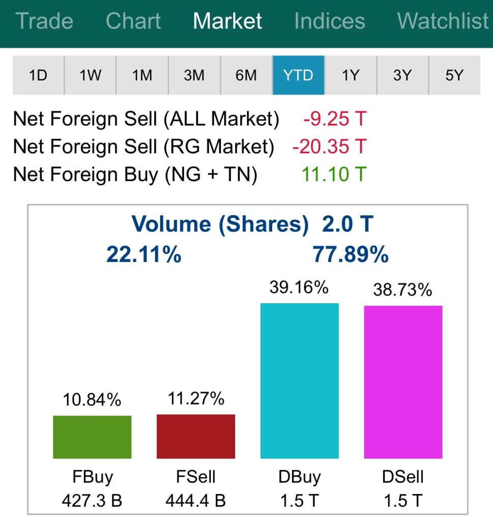 Informasi mengenai net buy dan net sell asing di IHSG dapat diperoleh dengan mudah di aplikasi RTI Business. Namun sayangnya mereka tidak menyediakan dalam bentuk grafik, tapi hanya akumulasi saja sehingga tidak bisa melihat tren jual belinya.