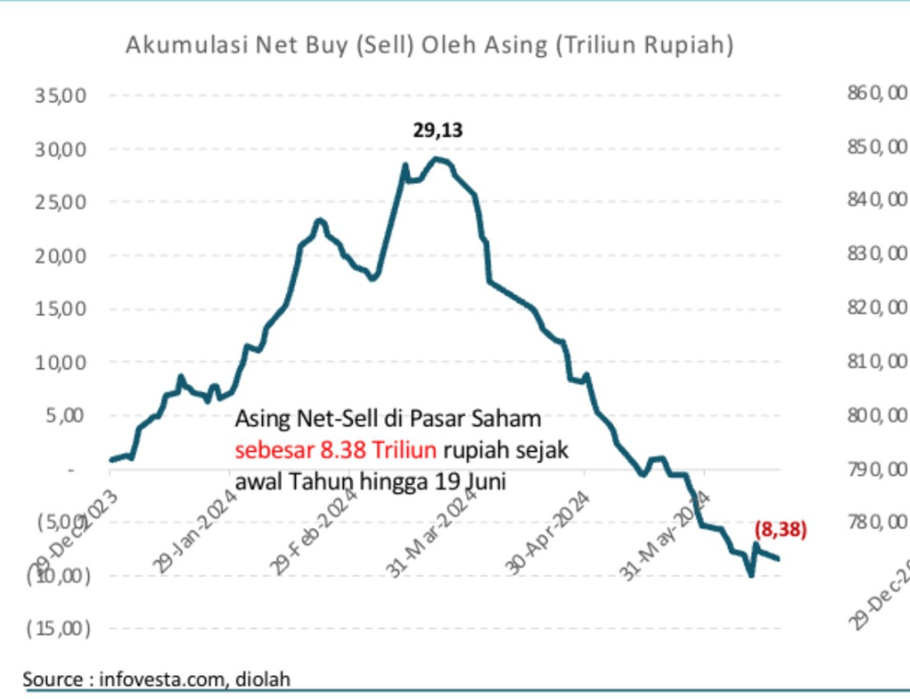 Hingga 19 Juni 2024, tercatat lebih dari Rp 44 Triliun++ dana asing mengalami net sell atau “kabur” dari pasar modal dari IHSG dan Obligasi Pemerintah Indonesia.