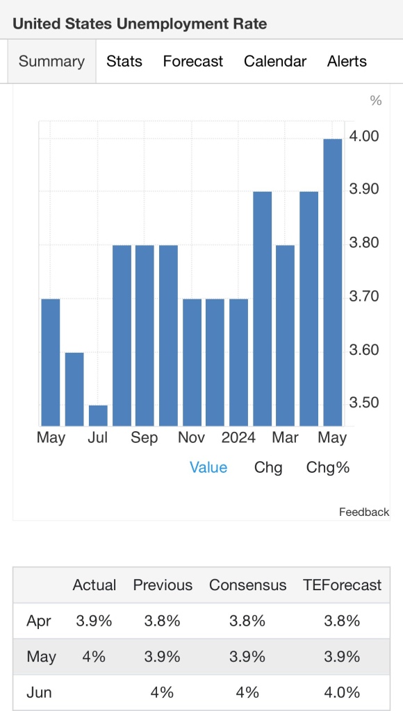 Ditambah angka pengangguran 🇺🇸 per Mei 24 naik ke 4%. Makin dekat ke target 5%, makin mendukung juga penurunan suku bunga 🇺🇸.