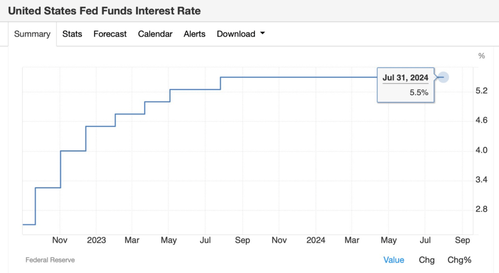 Secara teori, nilai tukar kurs tergantung dari tingkat suku bunganya. Jika suku bunga USD naik, maka nilai tukar USD akan menguat dan sebaliknya suku bunga USD turun maka nilai tukar USD akan melemah. Nah, suku bunga USD terakhir di 5.25-5.5% dan tidak berubah sejak Juli 2023.