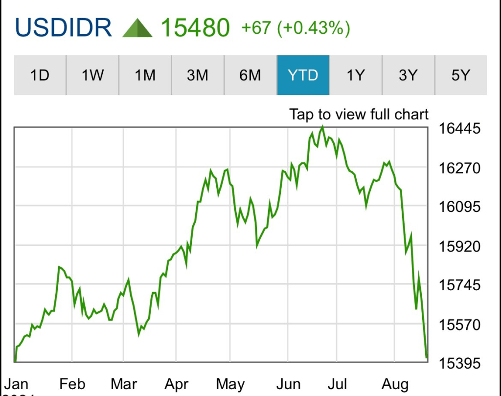 Per 21 Agustus 2024, nilai tukar Rp / USD sudah bergerak di bawah Rp 15.500.