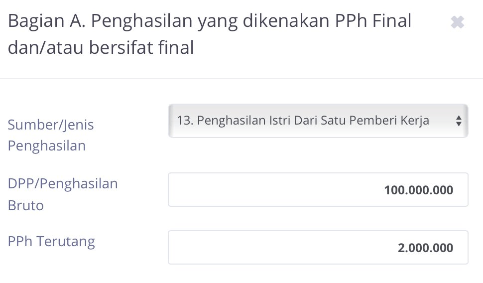 Hanya suami yang melapor, istri tidak mengisi lagi. Pengisian penghasilan istri oleh suami di Kolom Penghasilan Kena Pajak Final sebagai berikut: