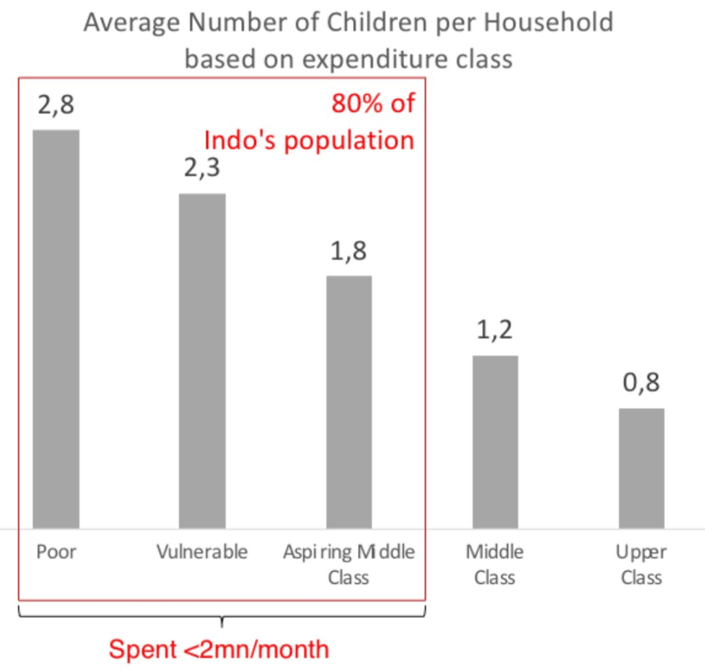 Penduduk 🇮🇩 yang masuk kategori miskin, rentan, dan menengah bawah punya 2-3 anak, dan itu 80% dari penduduk (pengeluaran < 2 juta / bulan). Yang menengah dan atas, ternyata hanya 20% dan punya anak rata-rata 1. Yang perlu dibantu, tentu 80%nya karena bisa angkat rata-rata nasional.