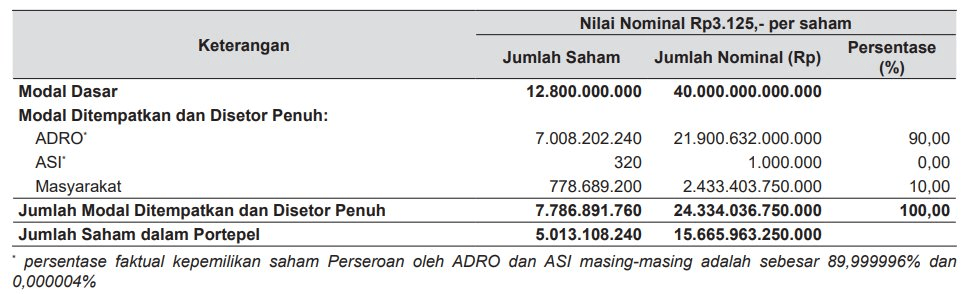 ADRO memiliki 90% saham setara 7.008.202.240 AADI yang nilai nominalnya Rp 3.125. Karena kepemilikan di atas 50%, maka laporan keuangan AADI akan di konsolidasi ke induknya.