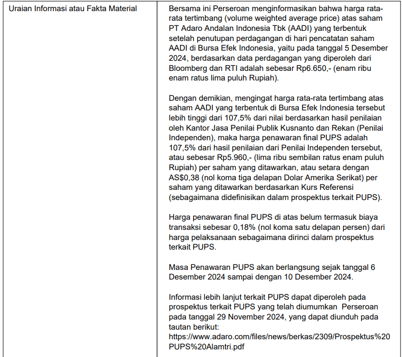 Tapi pada 6 Desember 2024, sesuai dengan prospektus, ADRO melakukan divestasi AADI dengan menawarkan 7 miliar++ lembar kepada kepada pemegang saham ADRO pada harga 5.960.