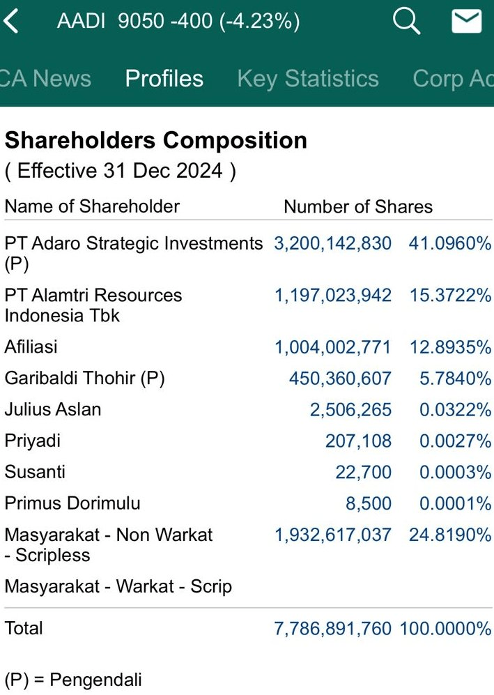 Sesuai prospektus AADI dan Keterbukaan Informasi, ADRO masih memiliki 1.197.023.942 lembar dengan harga nominal Rp 3.125. Harga penutupan AADI pada 31 Desember 2024 adalah Rp 8.475 atau untung Rp 5.350.