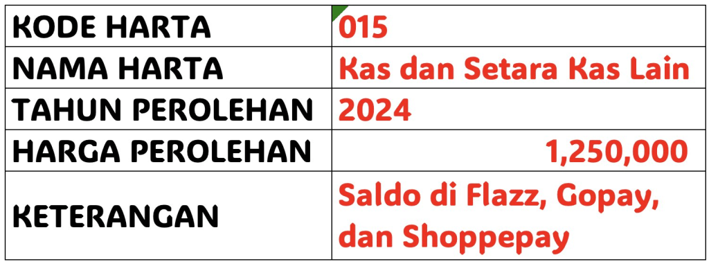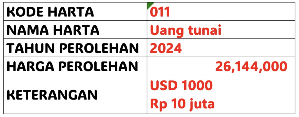 Contoh pada akhir 2024, uang tunai yang ada di dompet, bawah kasur, lemari, dan sebagainya adalah Rp 10 juta dan USD 1000 (kurs pajak Rp 16.144 setara Rp 16.144.000).