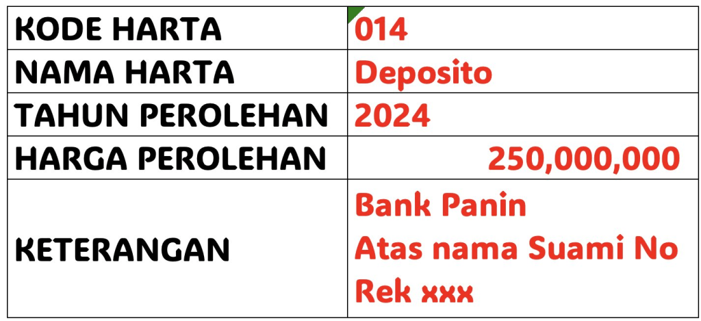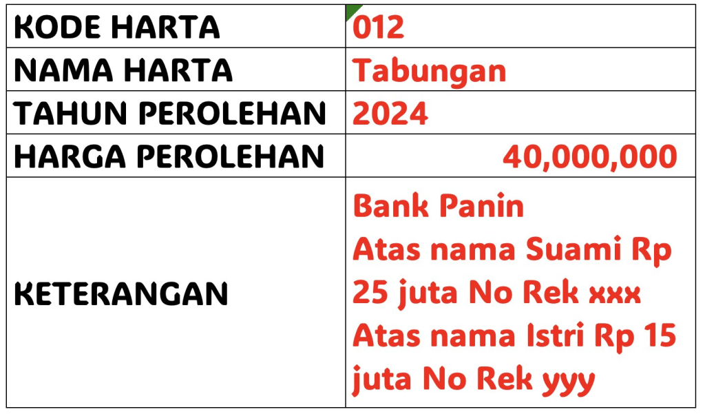 Pada akhir 2024, saldo yang ada di Tabungan Bank Panin Rp 25 juta atas nama suami dan Rp 15 juta atas nama istri. Sebagai informasi, pelaporan menggunakan KK sehingga harta suami dan istri dilaporkan di SPT Suami