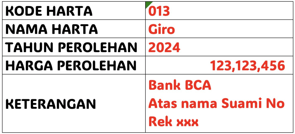 Pada akhir 2024, Suami memiliki saldo giro di Bank BCA Rp 123.123.456