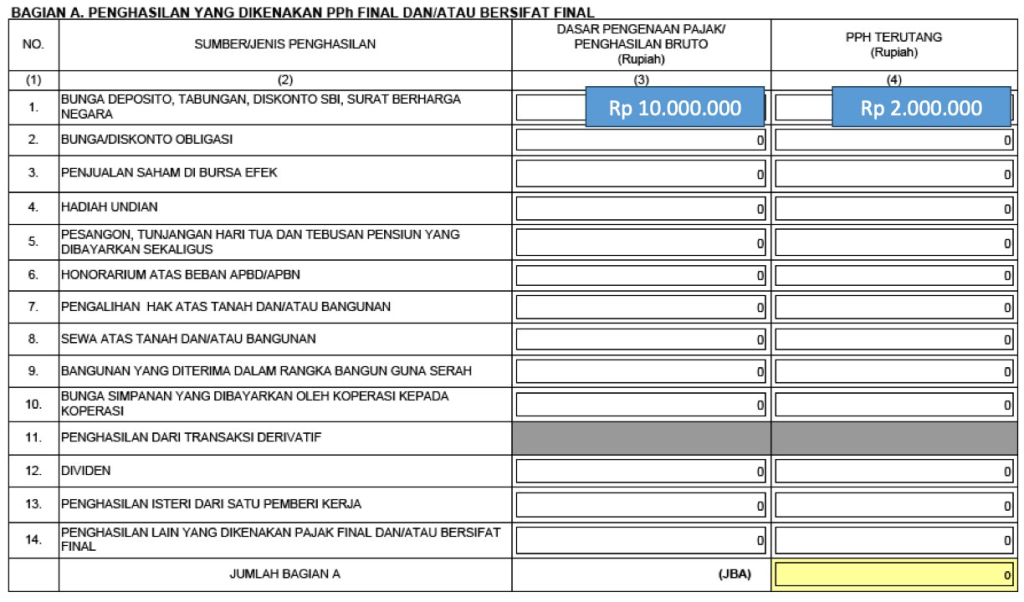 Atas bunga, dikenakan pajak 20%, sehingga nilai bunga bruto adalah Rp 8 juta dibagi 80% = Rp 10 juta.