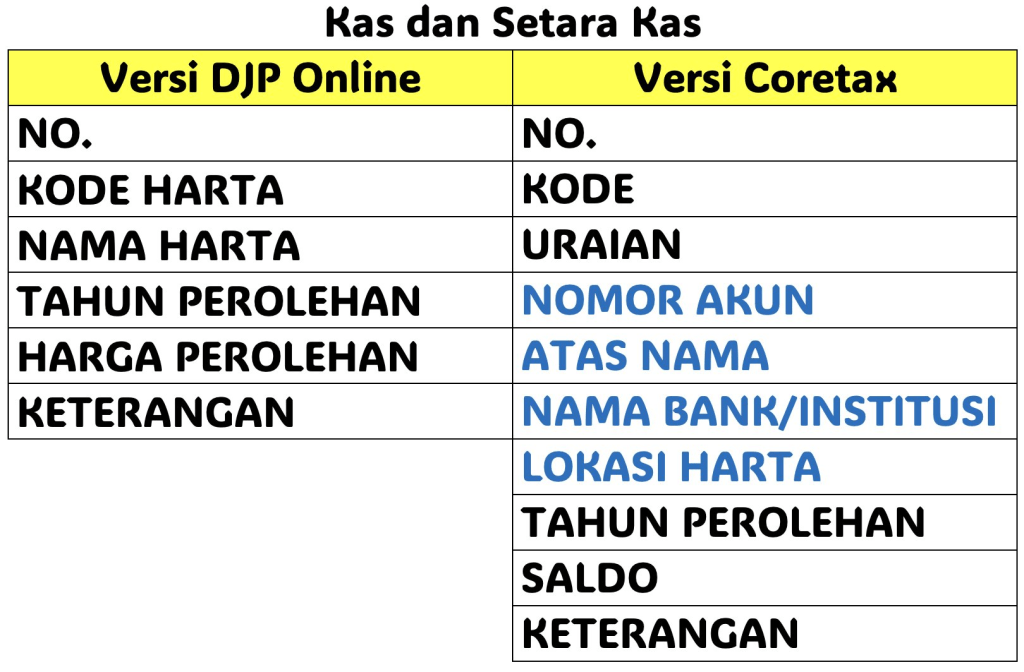 Untuk tampilan Coretax yang akan diisi tahun depan, data yang diminta sedikit lebih banyak. Jika di format lama nomor rekening tidak diminta, di format baru Nomor Akun, Atas Nama, Nama Bank diminta. Bahkan ada Lokasi Harta, in case ada di luar negeri.