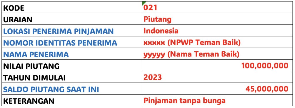 Piutang adalah salah satu bentuk Harta sehingga perlu dilaporkan dalam SPT. Demikian juga Hutang, yang bisa menjadi asal sumber harta wajib pajak selain Penghasilan, sehingga perlu dilaporkan juga.