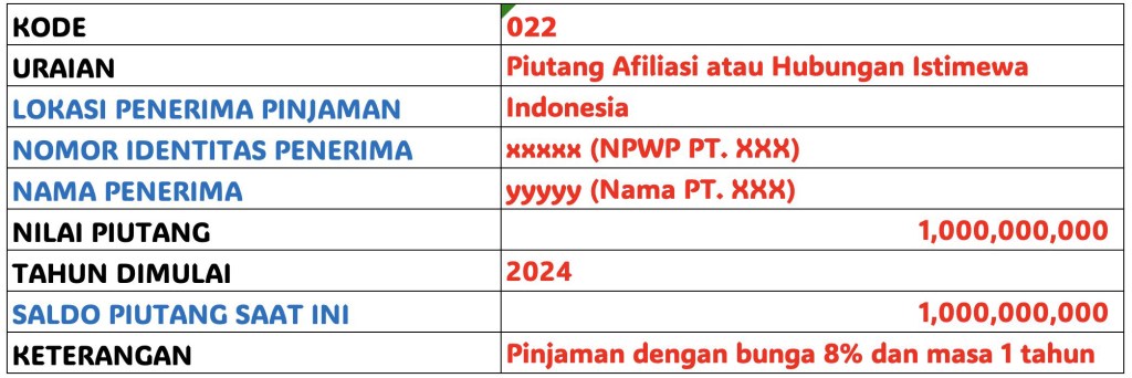Pengenaan bunga juga untuk menghindarkan praktek Transfer Pricing dalam perpajakan korporasi. Kode 029- Piutang Lainnya, bisa digunakan untuk Piutang selain no 021 dan 022. Tapi terus terang belum kepikiran seperti apa yang masuk dalam kode 029 ini