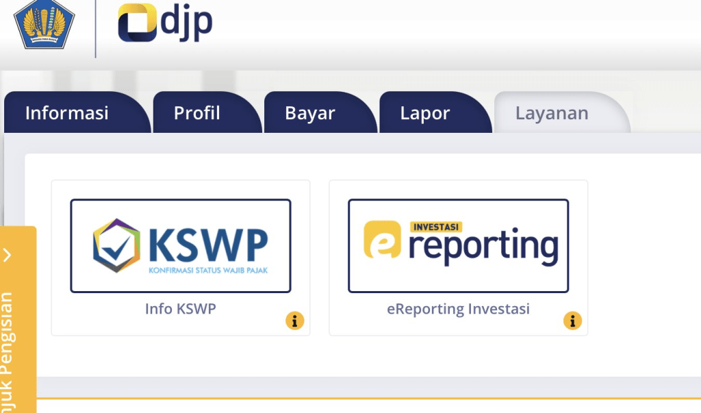 Pertama-tama log in ke website http://djponline.pajak.go.id kemudian klik Layanan eReporting Investasi. Apabila layanan ini tidak muncul, bisa melakukan aktivasi melalui Fitur – Aktivasi Fitur – Centang eReporting Investasi