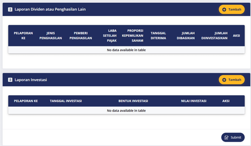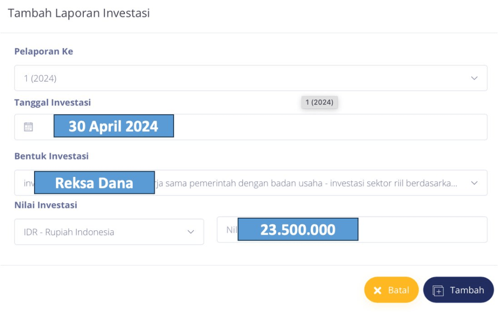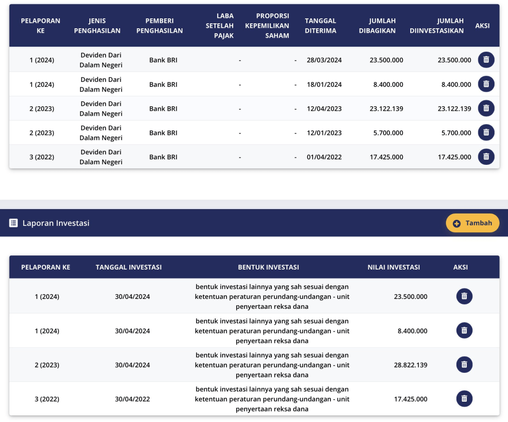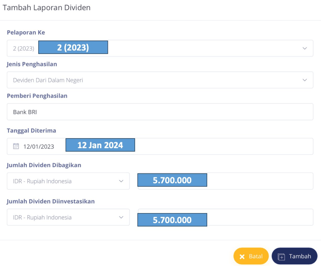 Apabila dalam 1 tahun menerima dividen 2 kali, maka pelaporan Rencana dilakukan 2 kali. Untuk realisasi, bisa digabung apabila memang reinvestasinya memang dilakukan sekaligus pada tanggal yang sama. Jika diperhatikan, pada Rencana dan Realisasi terdapat kolom Pelaporan Ke