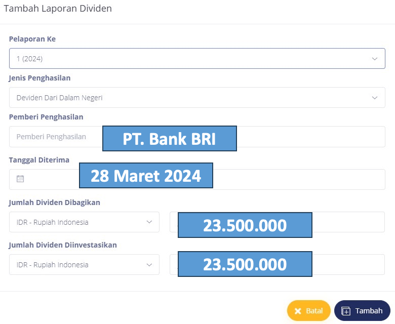 Contoh pengisian untuk Dividen yang diterima 28 Maret 2024