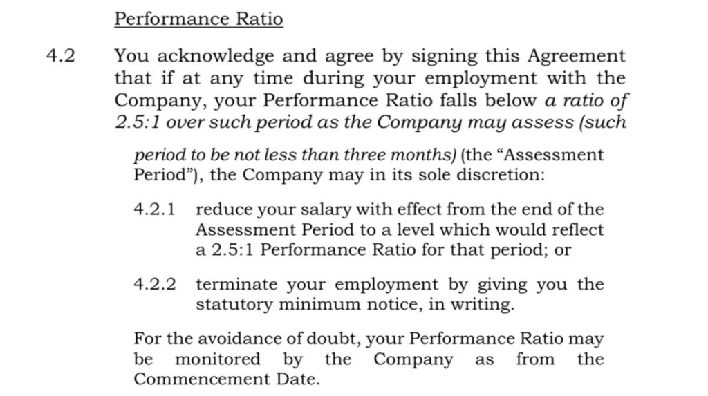 Poin mengenai Performance Ratio juga tercantum dalam klausul perjanjian dan apa tindak lanjut perusahaan jika tidak tercapai dalam 3 bulan. Grover mencoba membantah bahwa dia tidak diberikan waktu yang cukup untuk membaca dan performance ratio tidak wajar, tapi tidak berdasar.