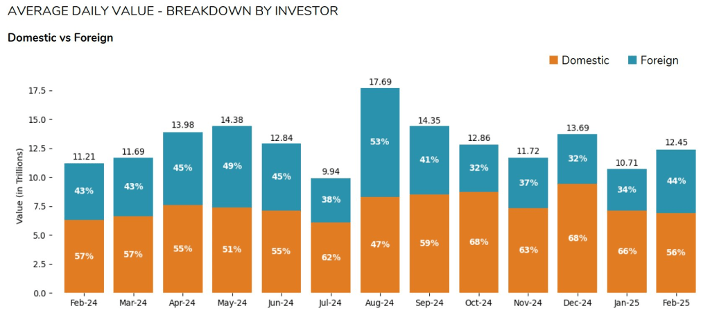 Dominasi transaksi investor lokal dibandingkan asing sudah terjadi sejak tahun 2020. Bahkan ketika masih masa pandemi, porsi transaksi lokal sempat mencapai 68-75% pada 2020-2022. Belakangan turun ke 58-60% tapi tetap saja, umumnya Asing Sell IHSG turun, Asing buy IHSG naik.