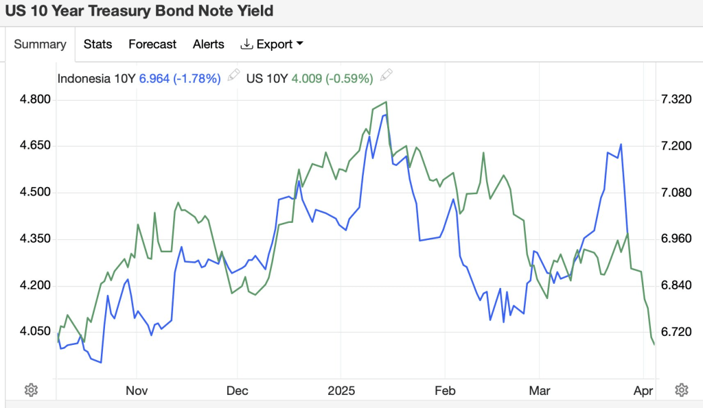 Yield turun itu seperti bunga turun. Dari 4.8% di awal tahun 2025 ke 4% di April 2025 ini. Bahkan ketika tarif diumumkan, penurunan Yield lebih tajam – artinya harga obligasi naik. Indonesia juga menunjukkan tren yang sama, dari 7.3% menjadi 7% dan kelihatan bisa turun terus.