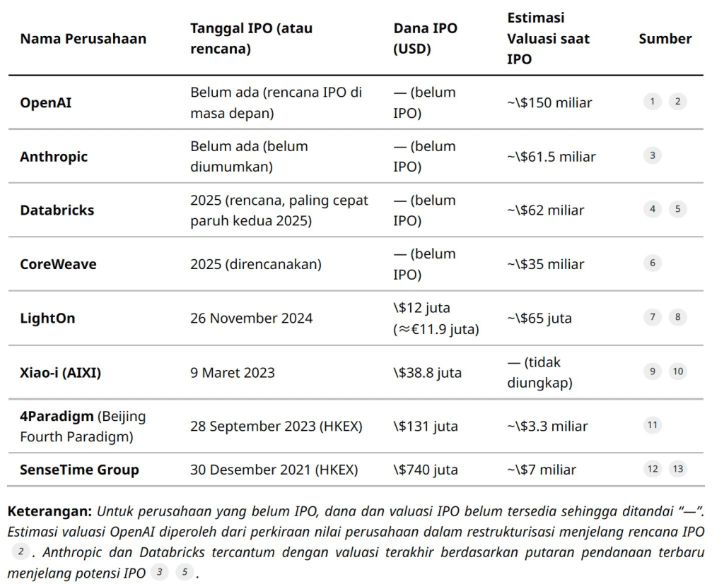 Yang dinanti-nanti adalah OpenAI pemilik ChatGPT dengan estimasi valuasi USD 150 Miliar (Rp 2.475 T) dan Antropic pemilik Claude USD 61.5 Miliar (Rp 1.014 T). Meskipun IPO, tipikal perusahaan teknologi, bisa jadi masih merugi. Tapi karena berpotensi mengancam Google, jadi dinanti-nantikan.