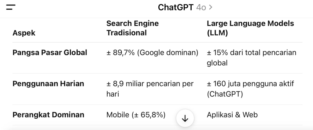 Sebagai referensi perbandingan antara Search Engine dan LLM masih seperti langit dan bumi. Tapi mengacu ke Nokia dan BlackBerry, anything can happen.. Search Engine juga bukannya duduk diam, mereka juga punya AI sendiri dan bukan tidak mungkin, akuisisi calon kompetitornya.