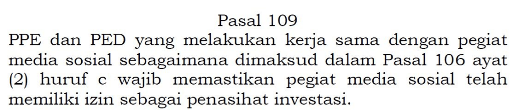 POJK ini spesifik mengatur influencer yang bekerja sama dengan Perusahaan Perantara Efek (PPE) atau yang biasa dikenal dengan nama Perusahaan Sekuritas.