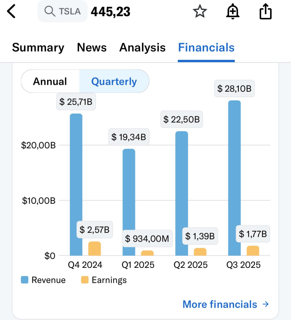 Kemudian ada Amazon yang juga hampir naik 100%, Apple yang naik 20%, dan cuma Tesla yang labanya turun di 2024. Untuk Q3 2025 sudah agak naik, dan mungkin juga jadi alasan Elon Musk memutuskan untuk tetap fokus ke perusahaan lagi