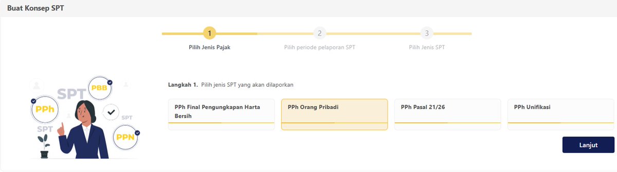 Selanjutnya pada Langkah 1 pilih Pph Orang Pribadi kemudian klik Lanjut yang ada di tombol kanan bawah.