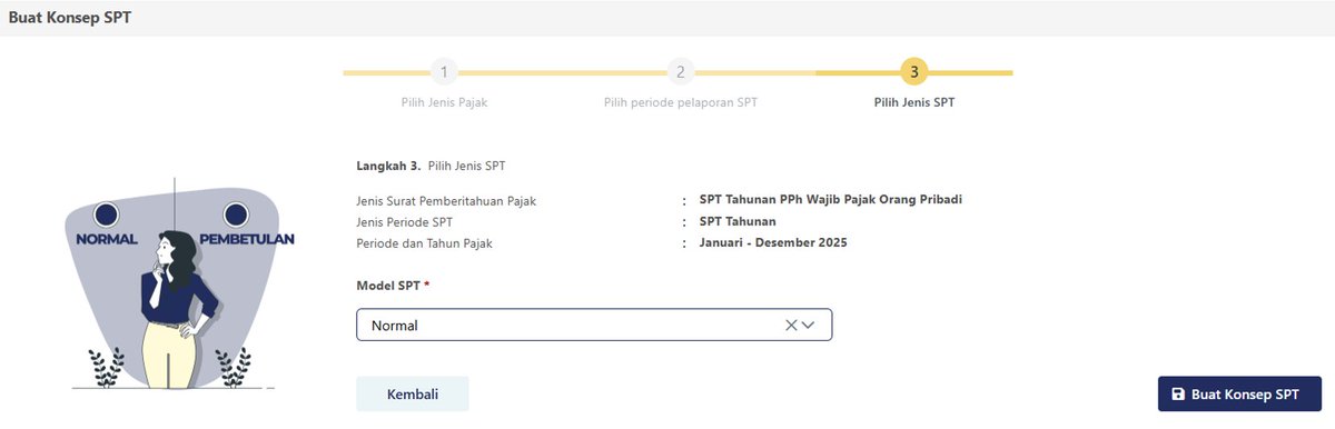 Pada Langkah 3, Model STP dipilih Normal. Jika sebelumnya anda sudah pernah lapor dan koreksi, maka model SPT akan berubah menjadi Pembetulan. Setelah dipilih kemudian klik Buat Konsep SPT.