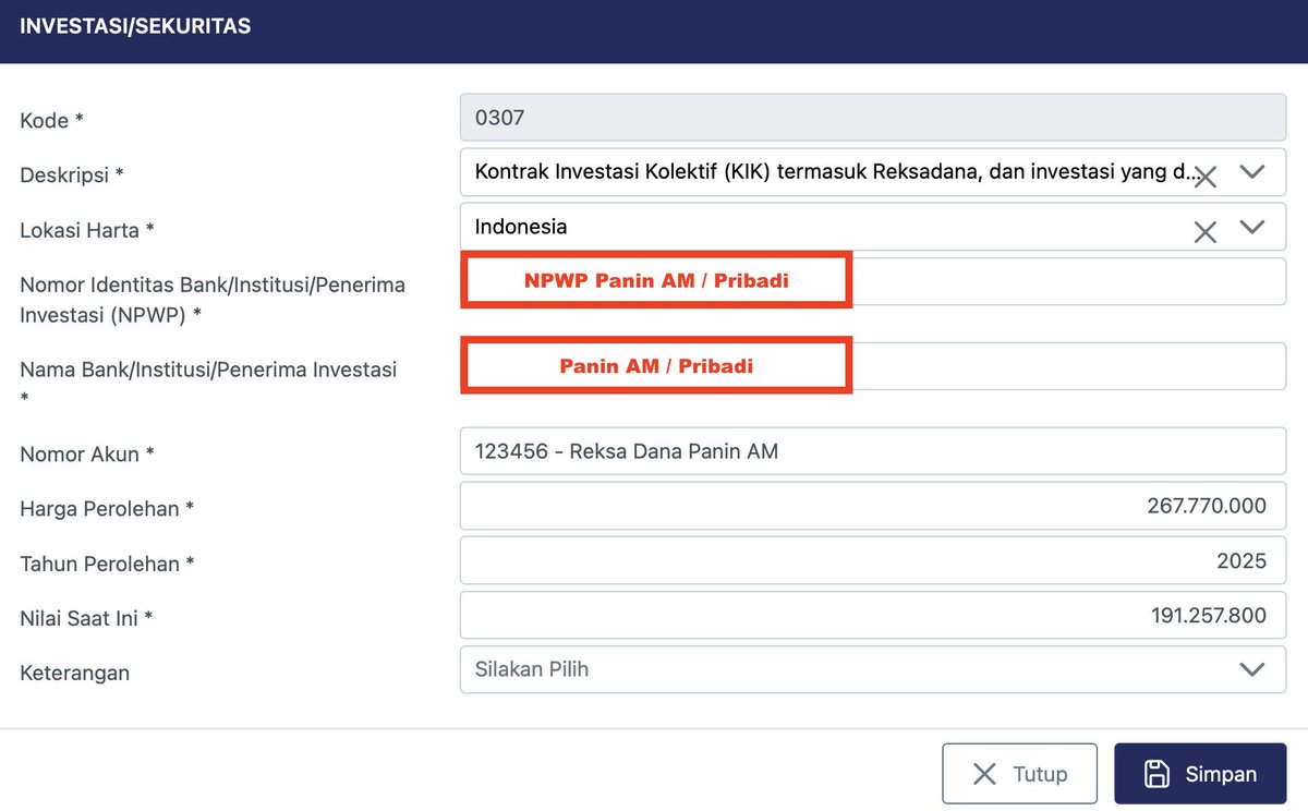 Secara input di SPT bisa, tinggal kita jumlahkan Harga Perolehan dan Harga Saat ini. Tahun perolehan menggunakan tahun terakhir transaksi. Untuk NPWP bisa diinput no perusahaan / pribadi, tapi di no Akun bisa ditambahkan keterangan Reksa Dana Panin AM seperti contoh di bawah.
