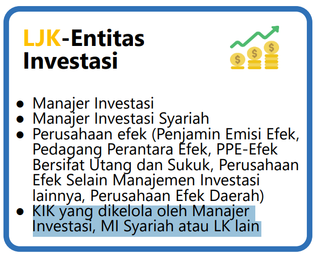 Mulai dari Bank, Kustodian, Asuransi, Manajer Investasi, Sekuritas, dan KIK (Reksa Dana), Lembaga Keuangan Mikro, Koperasi Simpan Pinjam, Trust Fund, Jasa Pembayaran, Modal Ventura, P2P Lending, Pedagang Berjangka, dan lainnya. Basically semua.
