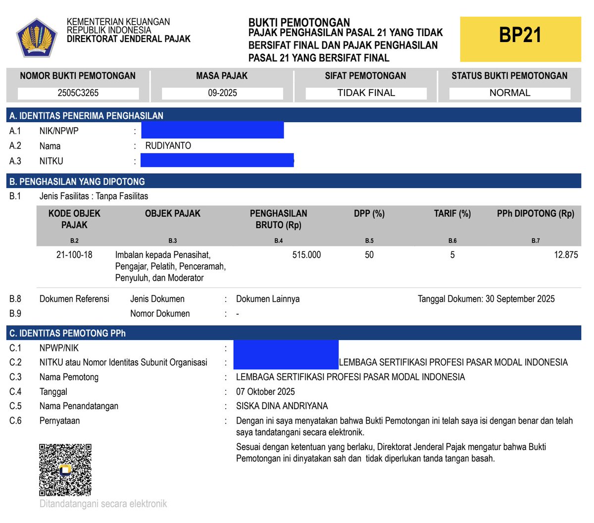 Untuk contoh kasus di atas dimana DPP 50%. Artinya saya mendapat bayaran dalam status dan jasa sebagai “Imbalan kepada Penasihat, Pengajar, Pelatih, Penceramah, Penyuluh, dan Moderator” kepada LSPPMI sebesar Rp 515.000. Atas penghasilan itu, pihak pemberi jasa “HARUS” memotong pajak 5%, makanya pasti diminta KTP atau NPWP untuk diinput. Apabila pemberi jasa tidak memperoleh no KTP / NPWP, maka akan kena koreksi fiskal dengan nilai sekitar 22% nilai di atas. Dalam bahasa Akuntansi perusahaan, ketika perusahaan membayar biaya jasa, maka keuntungan dan pajak atas keuntungan juga berkurang. Tapi karena tidak ada KTP, maka tidak bisa diakui sebagai expense pengurang laba bersih.