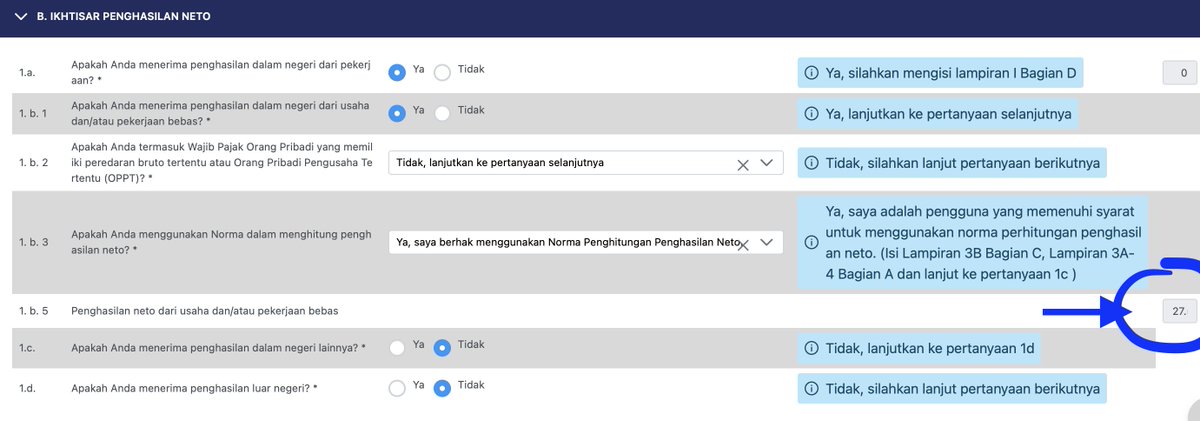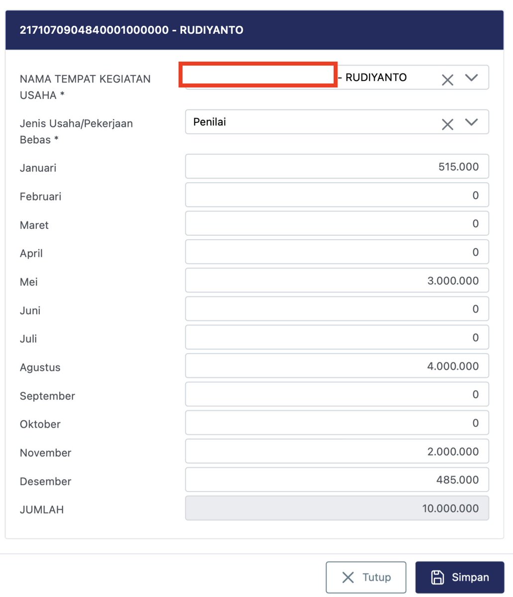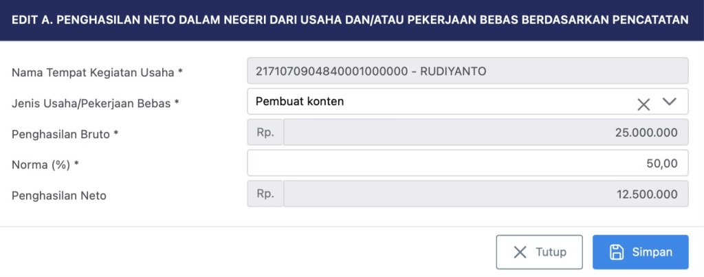 Untuk Jenis Usaha / Pekerjaan Bebas, saya tulis dengan Penilai (Asesor). Jika ada sampingan lain seperti konten kreator, pembicara dalam seminar, tinggal klik tambah dan isi lagi sesuai peredaran bruto.