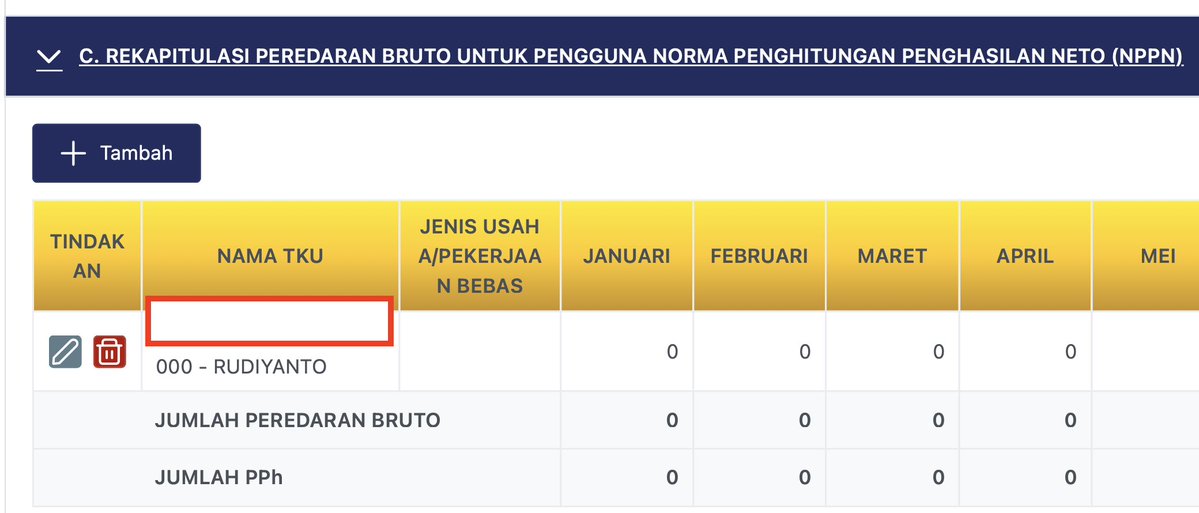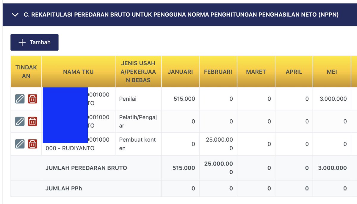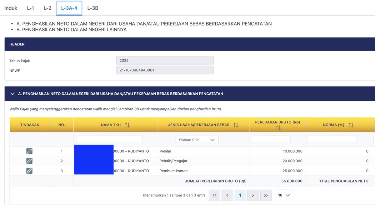 Pada bagian ini, sudah ada 1 tab yang terisi. Klik tanda pensil di bawah kolom Tindakan untuk Edit. Tapi sebelum masuk ke sini, penghasilan dari kegiatan Pekerjaan Bebas sudah direkap per bulan selama bulan di 2025. Angka yang direkap bukan uang masuk ke rekening yang Rp 502.125, tapi Peredaran Bruto yang Rp 515.000. Jika rekap sudah, klik tanda pensil.