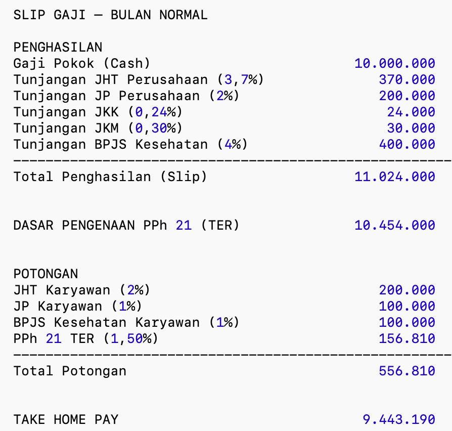 Cara baca tabel di atas dengan contoh Karyawan Laki-Laki status K1, gaji pokok Rp 10 juta, perusahaan menjalankan kewajiban BPJS sesuai aturan, pada bulan Januari akan mendapat slip gaji dengan bentuk di bawah ini