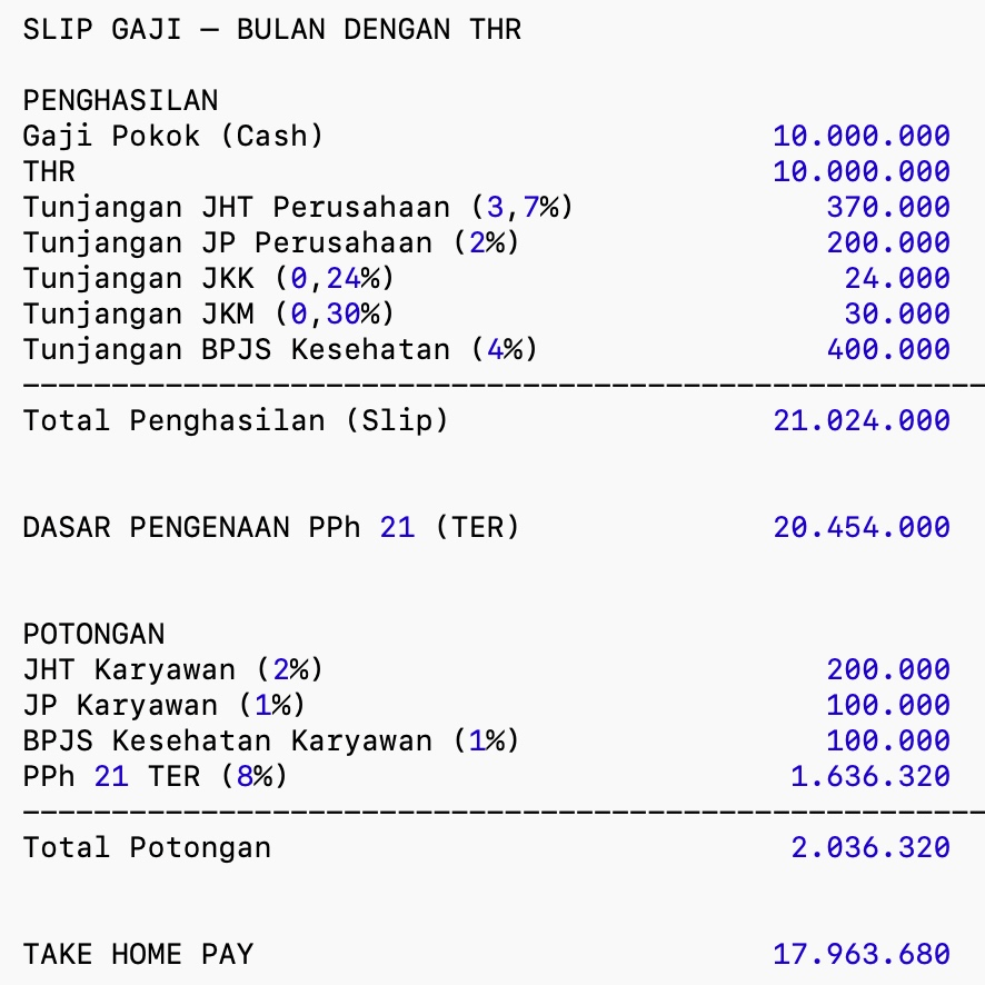 Sejak Tarif Efektif Rata-rata (TER) diterapkan, tergantung perusahaan, tapi umumnya Finance biasanya lebih prefer pembayaran dalam 1 bulan digabung sekaligus. Jadi semua Penghasilan mau itu gaji, bonus, tunjangan, THR yang dibayar Januari – November, dikalikan dengan % TER.