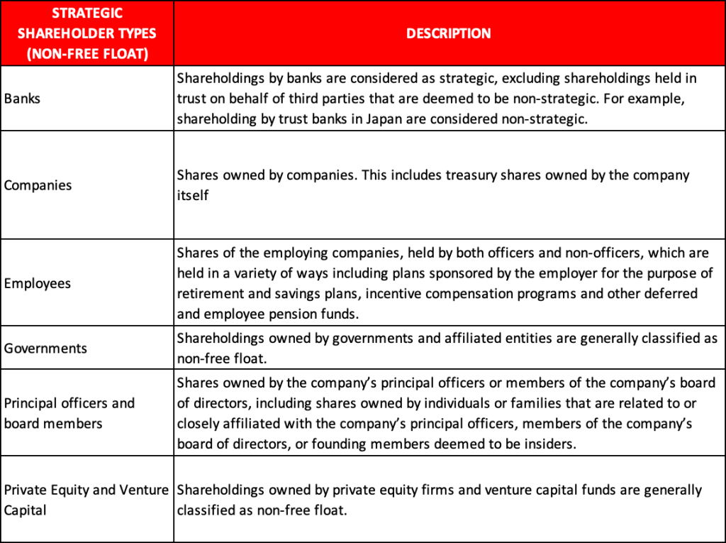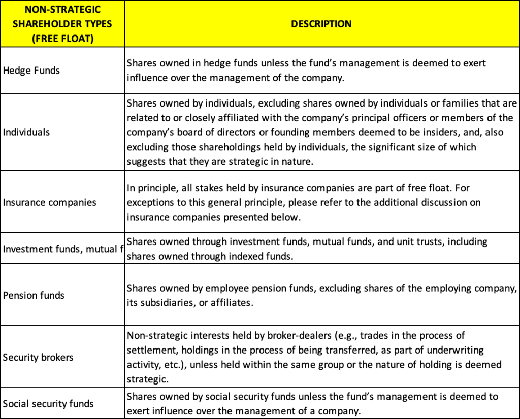 Untuk itu, Pertama kita harus mengetahui definisi free float MSCI. Berdasarkan dokumen yang terakhir di update Maret 2023, MSCI membagi kategori saham free float dan non free float sebagai berikut :
